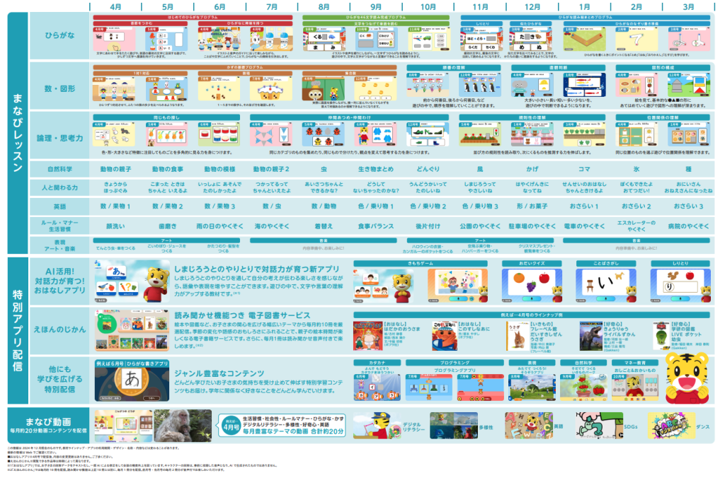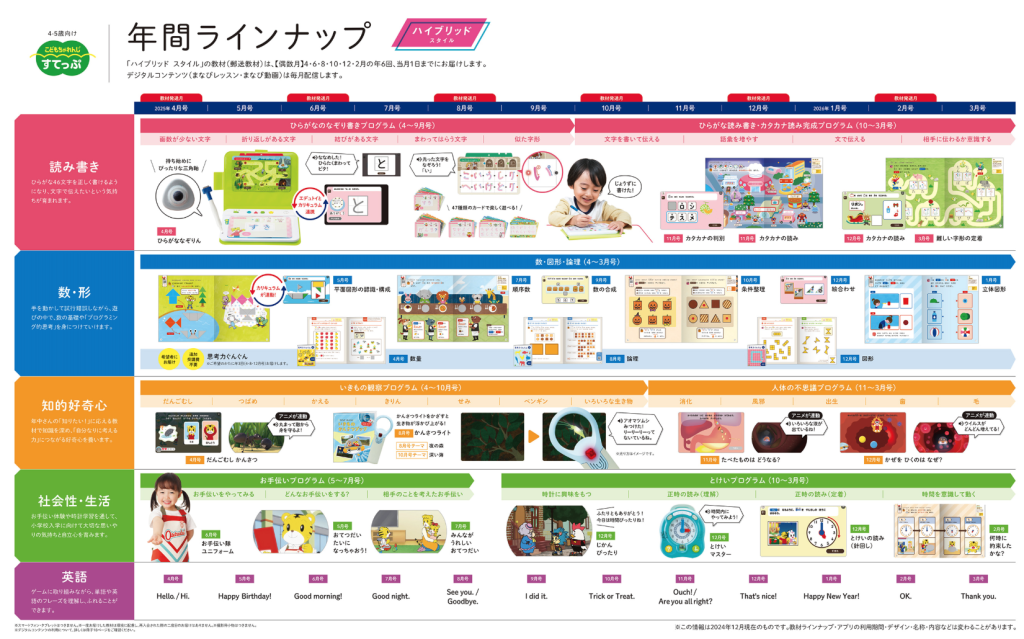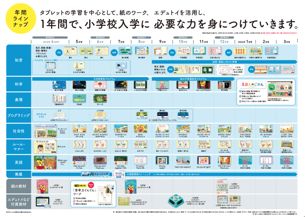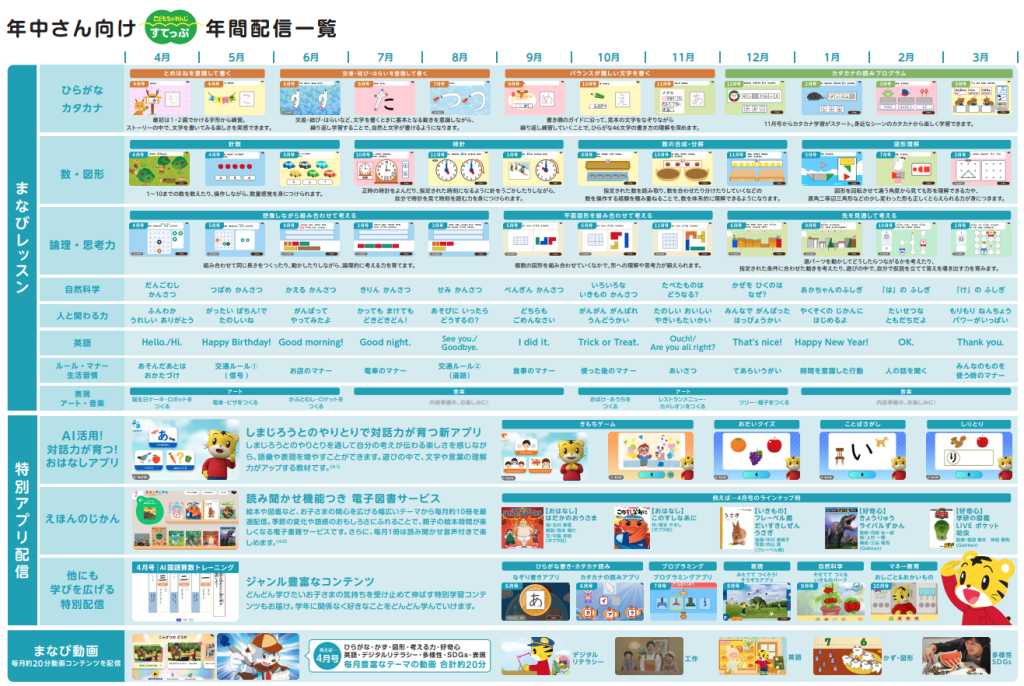 また、2025年度からは、新たなキャラクターや物語の展開が加わり、お子さまがより夢中になって学べる内容に進化しています。絵本や映像のストーリーを通じて、友だちとの関わり方やルールを学ぶ機会が増え、幼稚園・保育園の生活にもスムーズに慣れていけるような工夫がされています。