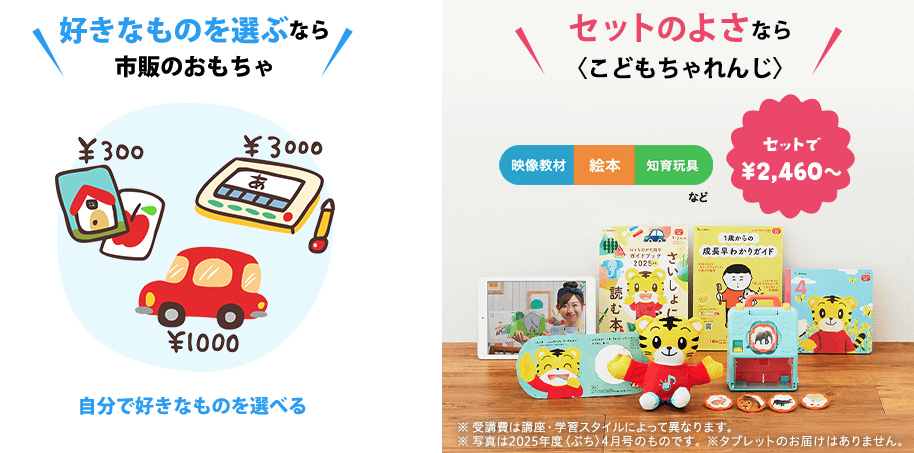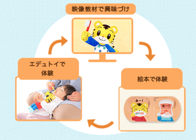 | 主な教材 | 知育玩具(音の出るおもちゃ等)、絵本、ワーク、DVD |