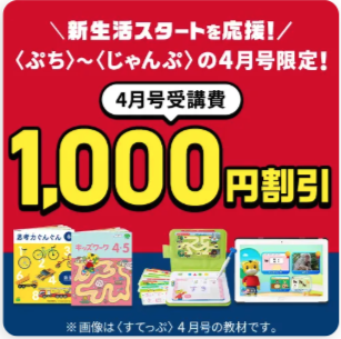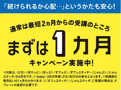 対象講座は〈ぷち〉〈ぽけっと〉〈ほっぷ〉〈すてっぷ〉〈じゃんぷ〉4月号です。※〈こどもちゃれんじじゃんぷ〉のみ、4月17日(木)まで4月号1か月のみのご受講も可能です。